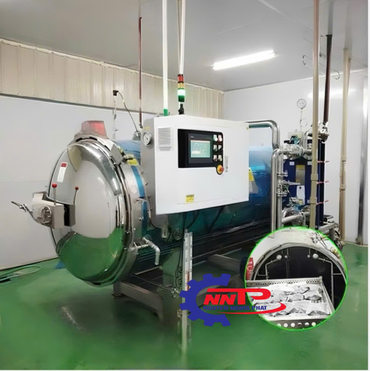Nồi hấp tiệt trùng công nghiệp là thiết bị chuyên dụng sử dụng hơi nước áp suất cao để khử trùng sản phẩm, loại bỏ vi khuẩn, vi sinh vật và các tác nhân gây hại. Quá trình tiệt trùng bằng nhiệt độ và áp suất giúp đảm bảo sản phẩm đạt tiêu chuẩn an toàn trong sản xuất thực phẩm, y tế và dược phẩm.
