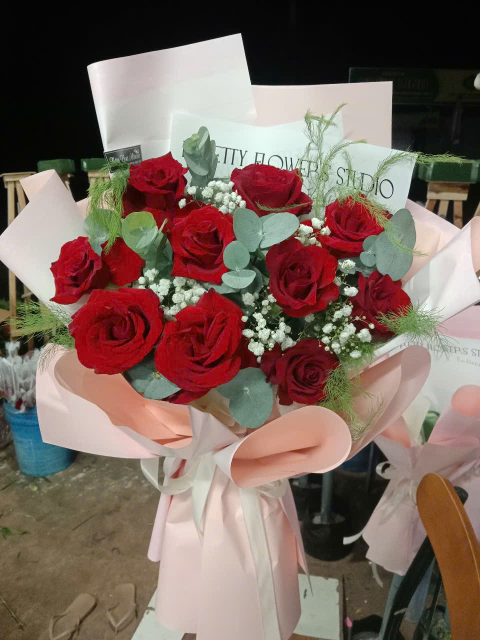 Bó kết hợp: Phối thêm hoa baby, lá bạc hoặc các phụ kiện trang trí.